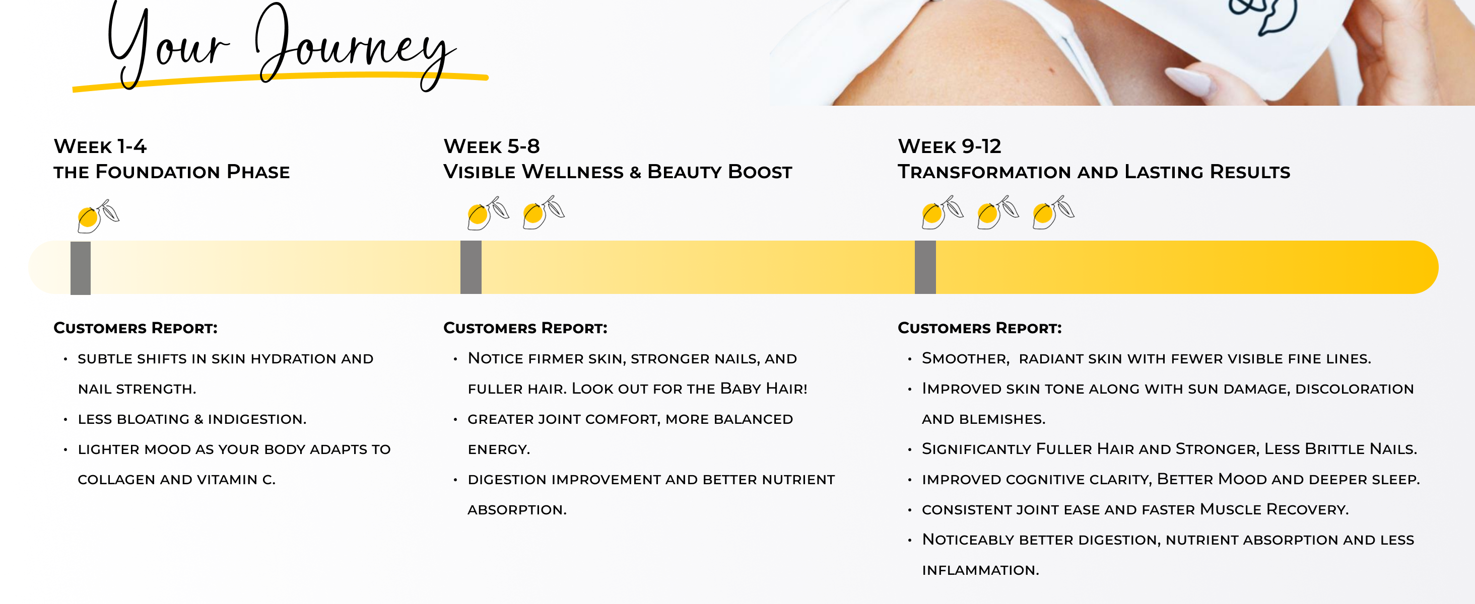 Our liquid collagen is formulated to meet the unique needs of women, providing essential nutrients that promote youthful skin, strong hair, and robust nails. Moreover, as we women get older, our joints, muscles and bones crave extra collagen to keep us flexible and fit. Our liquid collagen is enhanced with vitamin C, maximizing collagen synthesis and benefits. We designed this collagen lemon water with busy women in mind. Whether you are in the office, on the way to the gym or busy at home, these easy-to-mix liquid packets make collagen easy. Just mix with water and enjoy!